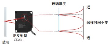激光位移傳感器CD33系列產品特點: ● 測量玻璃厚度 CD33-L□□正反射型傳感器可檢測玻璃表面,也可測量玻璃的厚度。